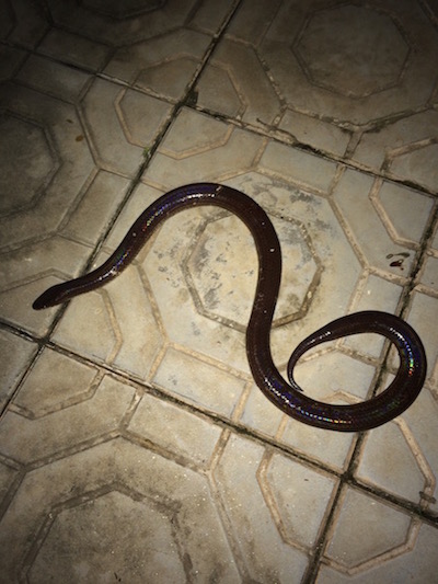 It is two to three feet long, dark brown to black in colour and was found in our front yard late last night, eating a toad.