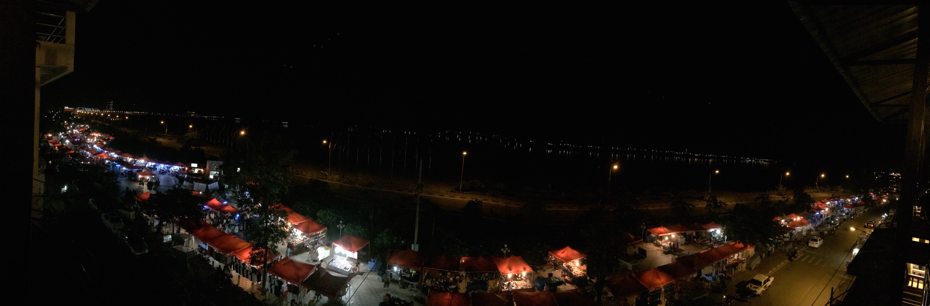 Vientiane night market panorama with the Mekong in the background and Thailand off to the distance.