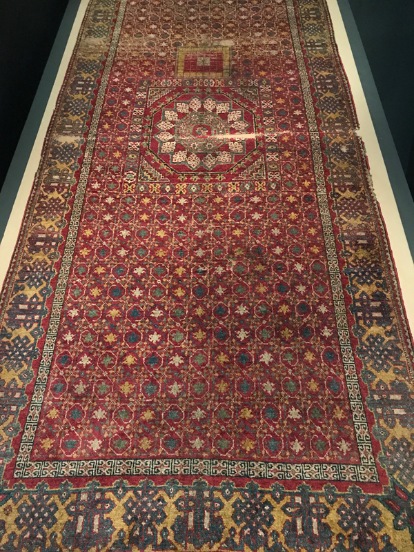 Early 15th century silk pile Ashtapada (Chessboard) carpet from Central Asia.