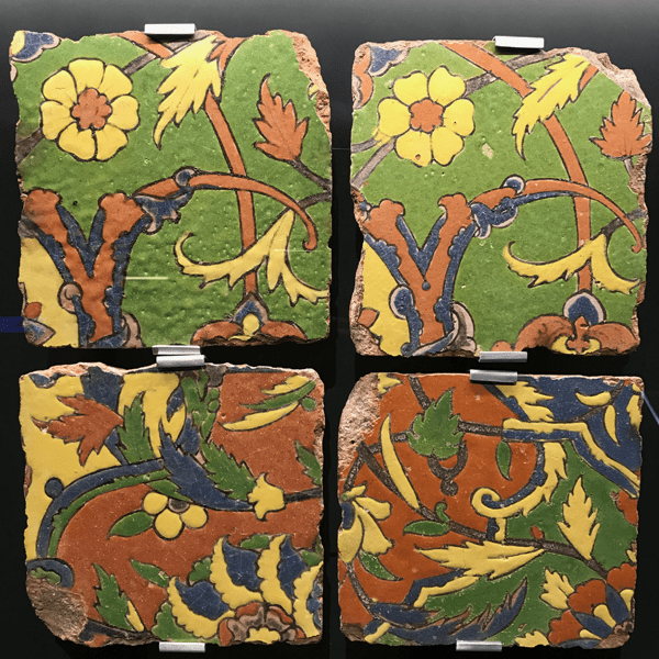 17th century Cuerda Seca tiles from Kashmir or Lahore. Tiles like this were traditionally used to decorate the walls of both palaces and tombs. The Cuerda Seca technique involves the use of thin lines of some sort of greasy substance to prevent the water soluble glazes running together.