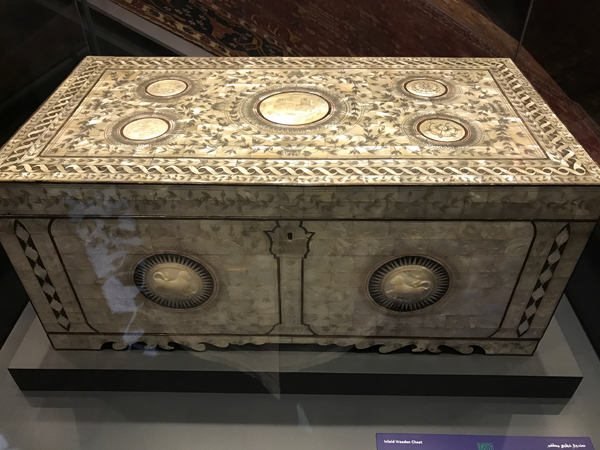 18th century Ottoman wooden chest inlaid with mother-of-pearl. There is a mirror inside the box (not visible here) that suggests it was used by an elite member of the court.