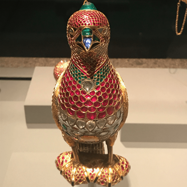 Jeweled Falcon from India c1640. Gold and enamel encrusted with rubies, emeralds, diamonds, sapphires and onyx.